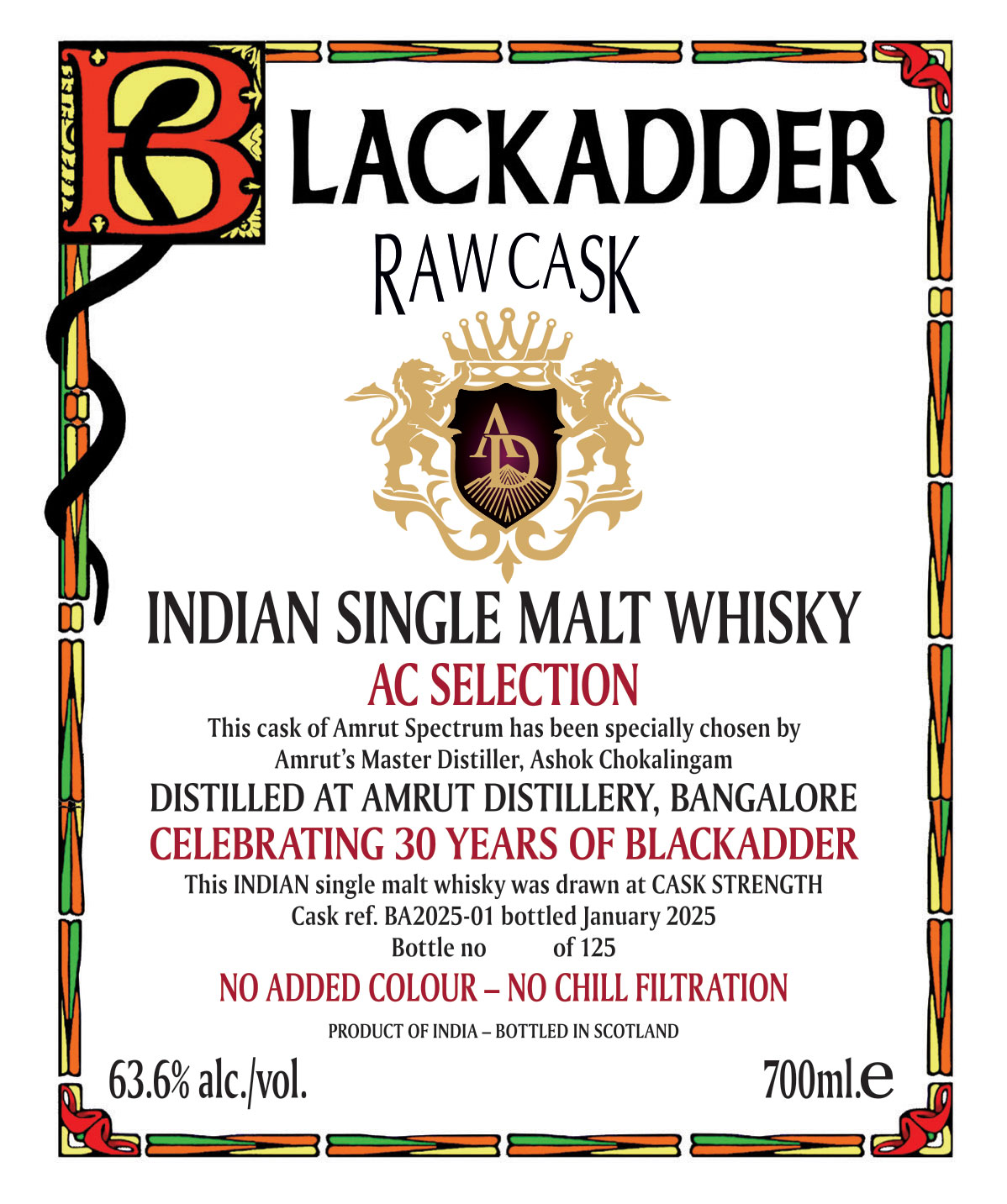 Blackadder RAW CASK en "Single Cask" whisky så som den en gång var, då man drack whisky som såldes direkt från ett fat bakom bardisken. Då Blackadder RAW CASK är Cask Strength med hög alkoholhalt, rekommenderar vi att du blandar den med en nästan lika stor del vatten. Men då mängden vatten som tillsätts är högst personlig, så är det ditt val hur mycket vatten som önskas.