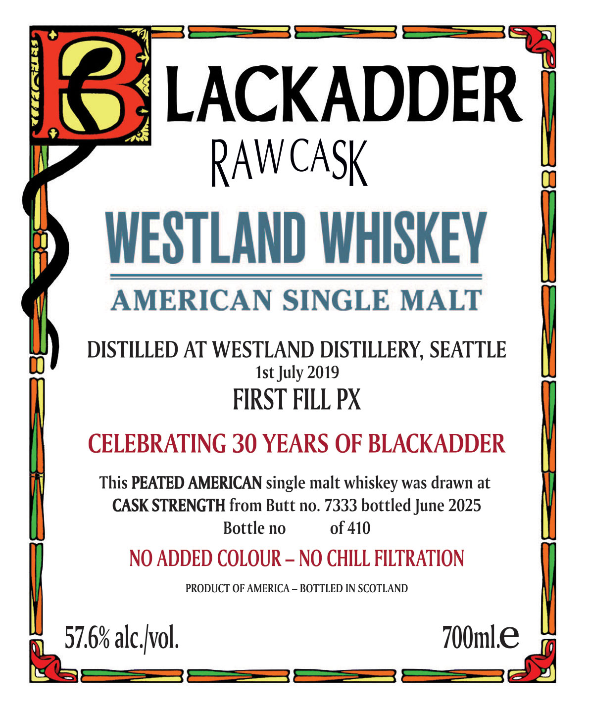Blackadder RAW CASK en "Single Cask" whisky så som den en gång var, då man drack whisky som såldes direkt från ett fat bakom bardisken. Då Blackadder RAW CASK är Cask Strength med hög alkoholhalt, rekommenderar vi att du blandar den med en nästan lika stor del vatten. Men då mängden vatten som tillsätts är högst personlig, så är det ditt val hur mycket vatten som önskas.