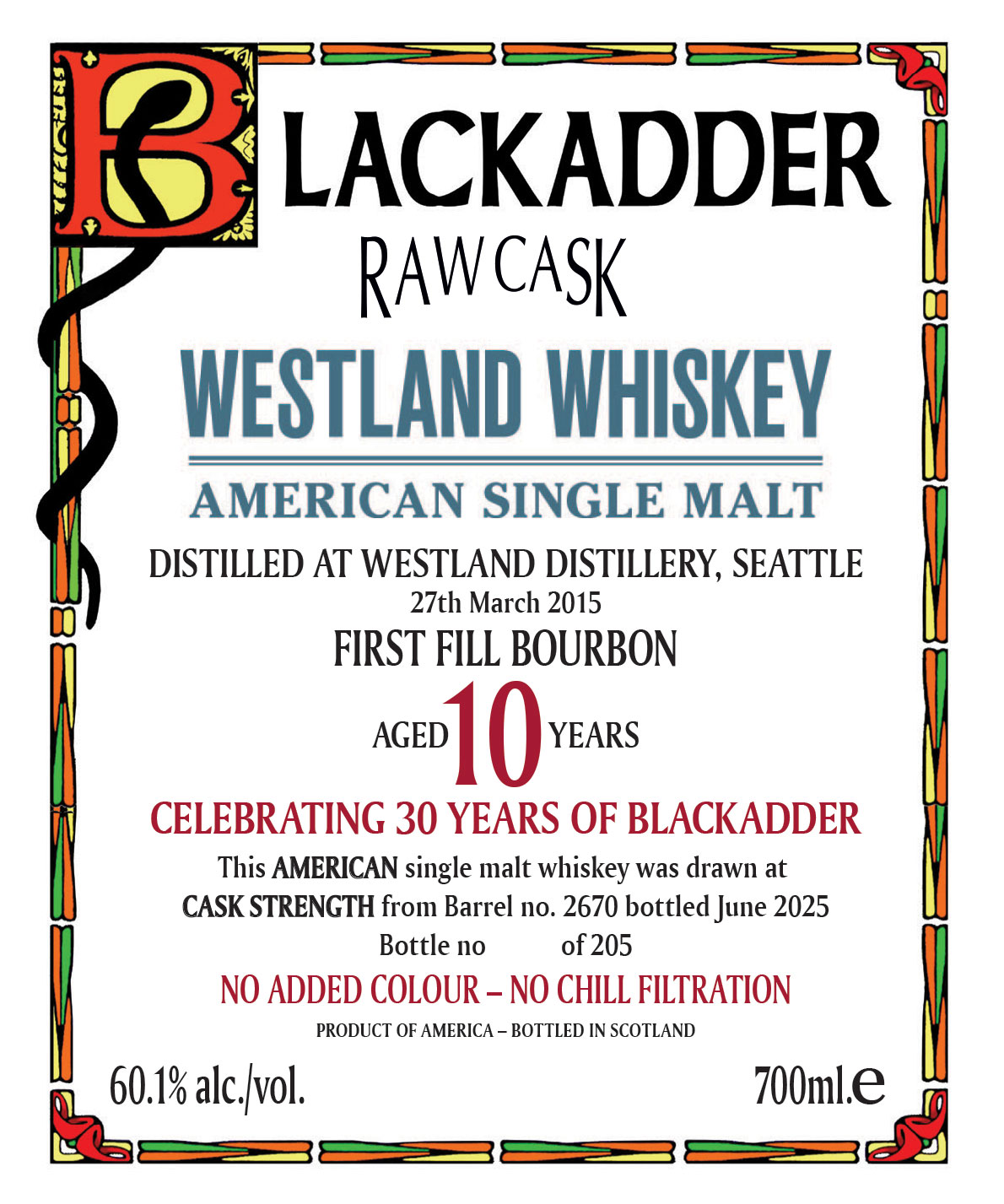 Blackadder RAW CASK en "Single Cask" whisky så som den en gång var, då man drack whisky som såldes direkt från ett fat bakom bardisken. Då Blackadder RAW CASK är Cask Strength med hög alkoholhalt, rekommenderar vi att du blandar den med en nästan lika stor del vatten. Men då mängden vatten som tillsätts är högst personlig, så är det ditt val hur mycket vatten som önskas.